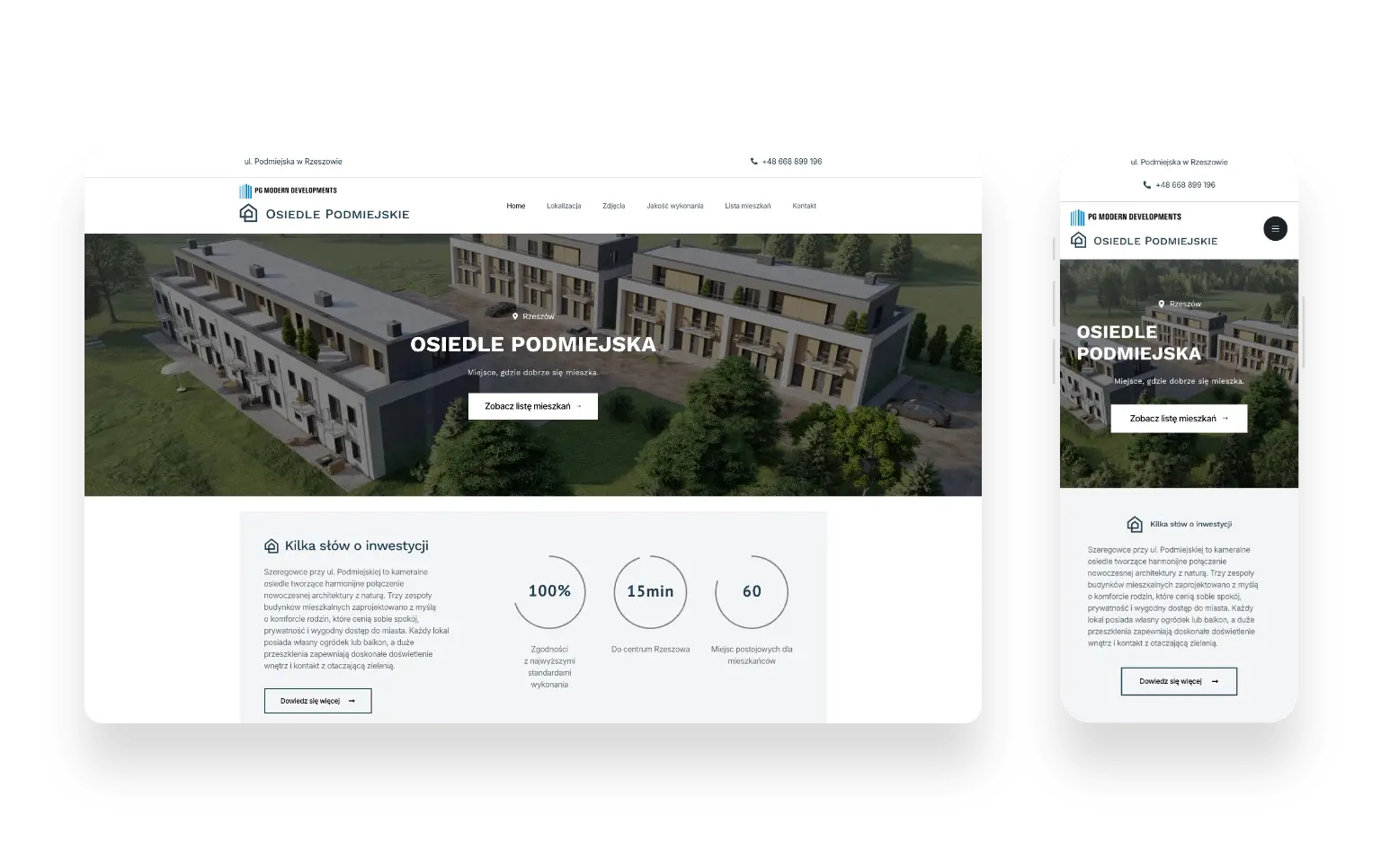 Całość została zaprojektowana w pełni responsywnie, z intuicyjną nawigacją i wyraźnymi ścieżkami kontaktu. Nowoczesny, stonowany design, duże zdjęcia oraz czytelna typografia wzmacniają wizerunek inwestycji jako komfortowego i dobrze zaprojektowanego miejsca do życia.