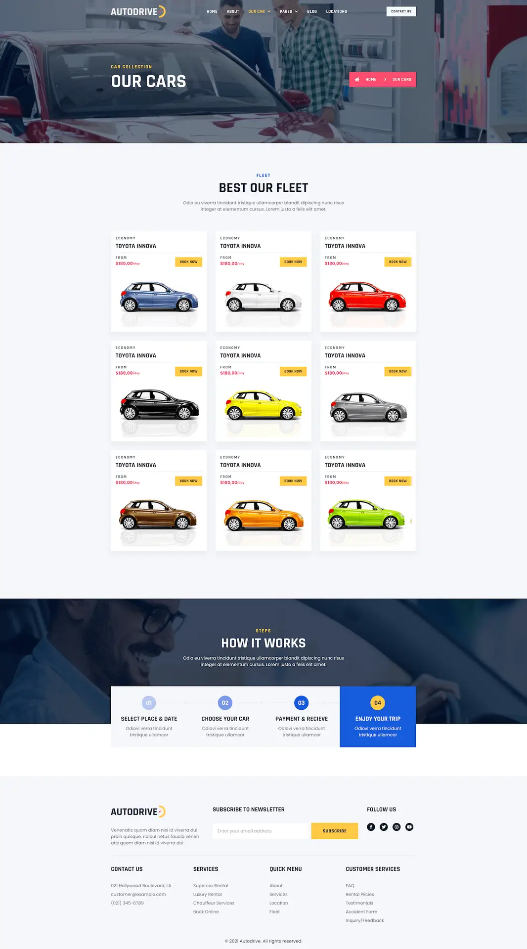 Autodrive to profesjonalne rozwiązanie dla firm zajmujących się wynajmem samochodów, limuzyn, środków transportu, naprawą samochodów, salonów samochodowych i motocyklowych, a także dla sprzedawców samochodów, którzy chcą promować swoją ofertę. Ten gotowy zestaw szablonów został zaprojektowany z myślą o tworzeniu nowoczesnych, responsywnych stron internetowych w prosty i szybki sposób. Dzięki przejrzystemu układowi i łatwej edycji, szablon Autodrive pozwala wyróżnić się na tle konkurencji i przyciągnąć nowych klientów.